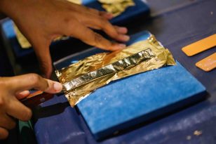 – Gobaith – Hope is crafted from material found on the factory floor and from within Liaqat Rasul’s collection saved over the years.